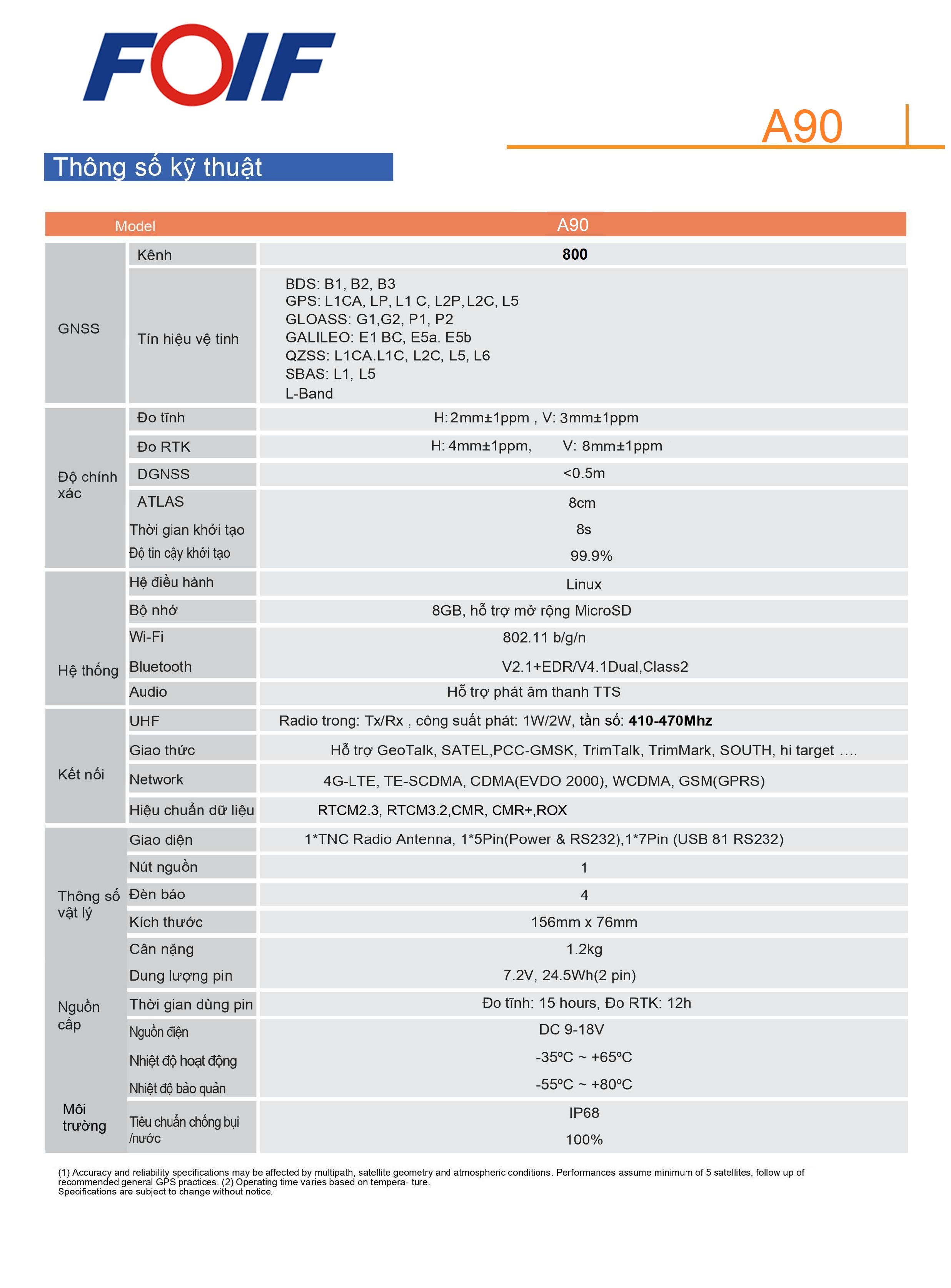 ) Hiệu suất tuyệt vời: Được thiết kế với mô-đun GNSS độ nhạy cao, A90 có thể thực hiện các cuộc khảo sát lớn: RTK, DGPS, (SBAS), Tĩnh, v.v.