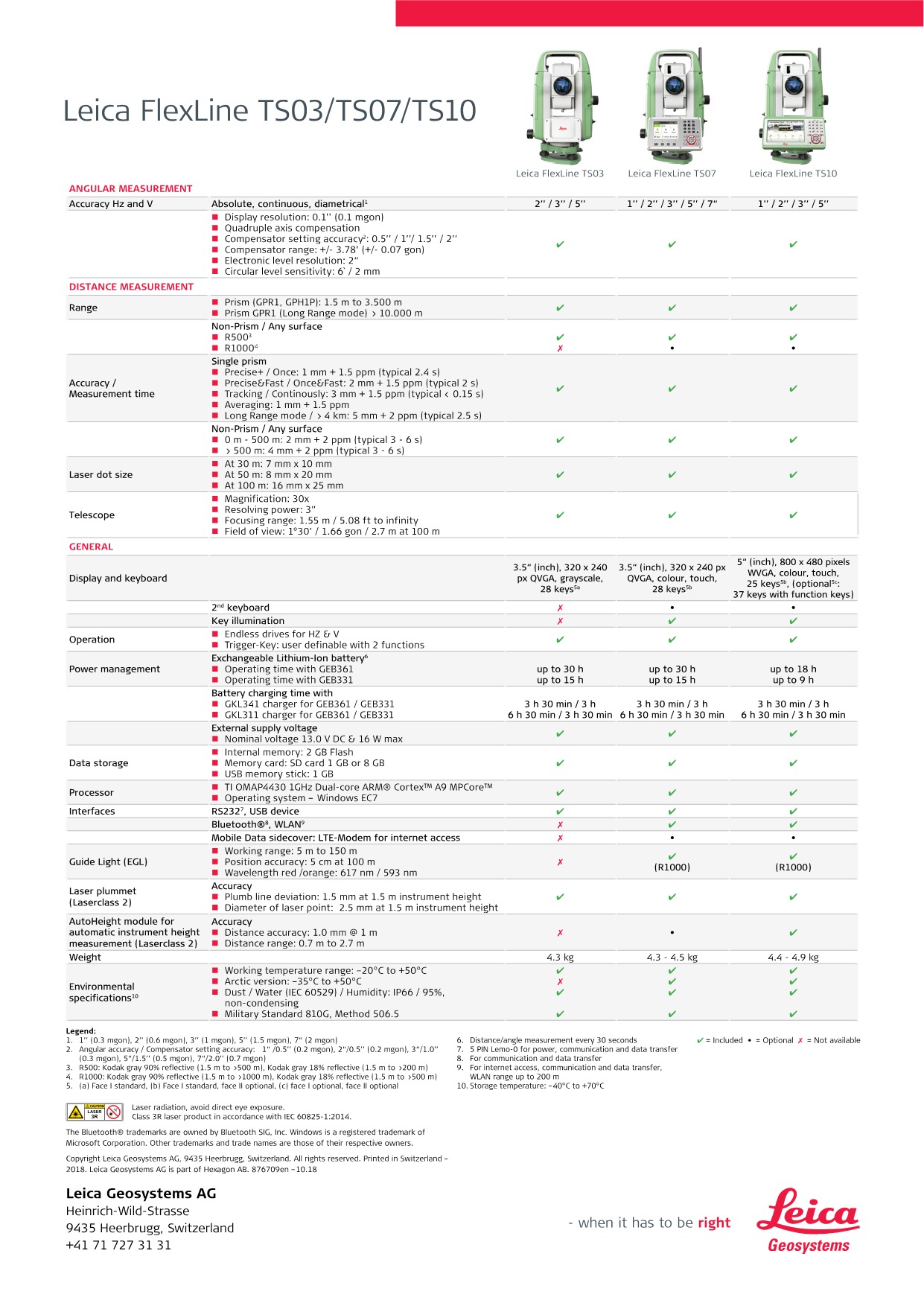 - Độ bền cực cao: thậm chí sau nhiều năm sử dụng trong điều kiện khắc nghiệt (như bùn, bụi, mưa thổi, nhiệt độ cực cao và lạnh), toàn đạc Leica FlexLine vẫn hoạt động với cùng độ chính xác và độ tin cậy như ban đầu.